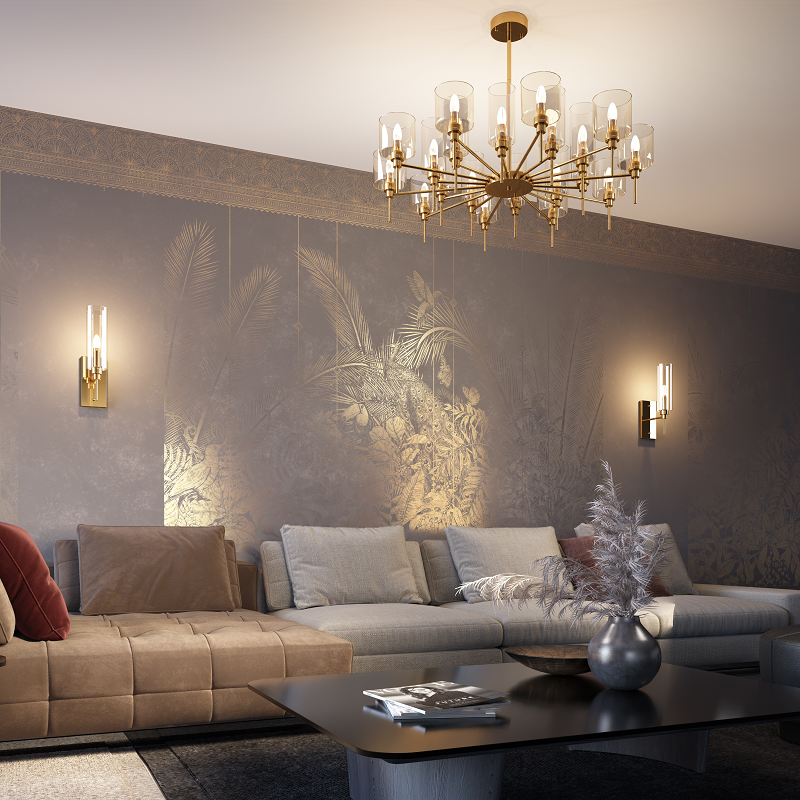Диаметр люстры важен не меньше ее дизайна. Рассчитать нужный размер можно по формуле: (длина комнаты+ ширина комнаты)x10 = диаметр. К примеру, если длина стены в спальне 6 м, а ширина – 4 м, (6+4) x 10=100 см – нужный диаметр светильника.