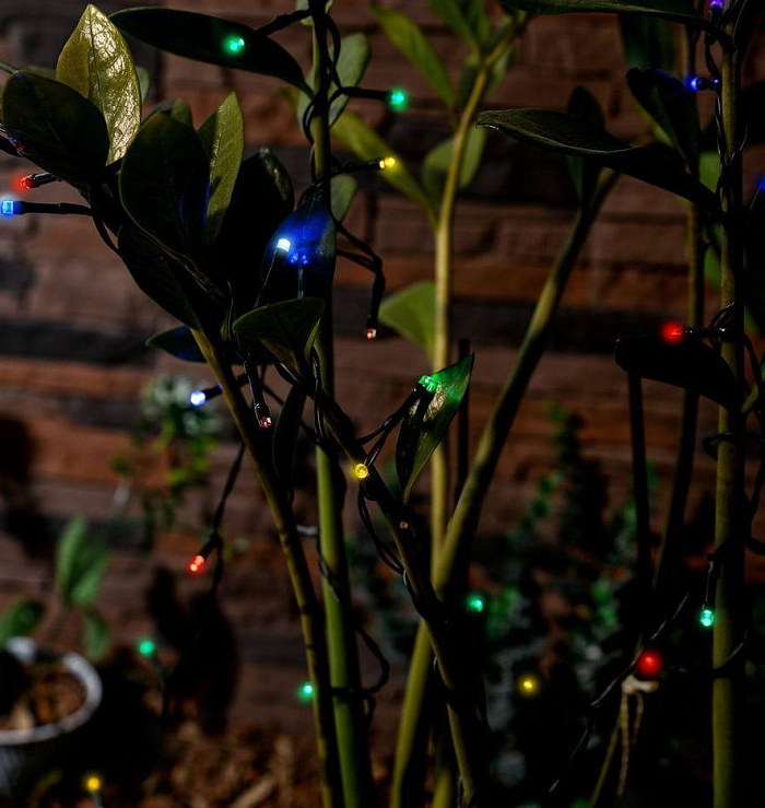 Таинственную и праздничную атмосферу на участке можно создать с помощью специальных садовых гирлянд на солнечных батареях. Просто разместите гирлянды в кроне ближайших к клумбе кустов или деревьев. В данном случае ствол дерева выступает в роли своеобразного фонарного столба. Садовые гирлянды неприхотливы в уходе, незаметны в светлое время суток, зато вечером обеспечивает яркую эффектную иллюминацию.