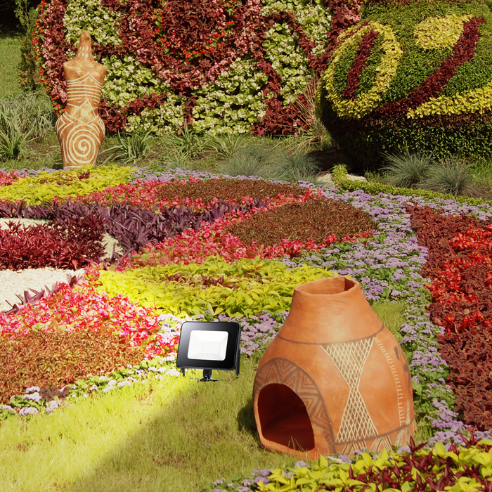 Фронтальную подсветку (когда источник света устанавливается спереди объекта) используют при подсветке клумб, альпийских горок, топиариев и многоярусных клумб. Тени при таком освещении не видны, поэтому общая картинка кажется более яркой.