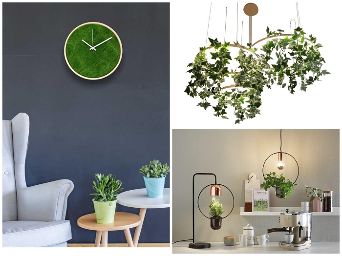 Чтобы весна ощущалась не только за окном, но и вашей квартире, внесите освежающее разнообразие в интерьер с помощью новых комнатных растений. В целях эргономики производители освещения начали встраивать кашпо прямо в корпус светильников. Теперь вместо привычных подвесок на люстре может запросто красоваться зеленый плющ или какое-нибудь красивое экзотическое растение. Также довольно популярно сейчас использование декора со стабилизированным мхом или его имитацией (как на часах на картинке выше).