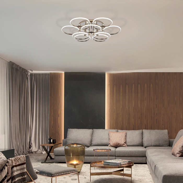 Благодаря своему стильному, немного космическому виду светильники-кольца часто выбирают для оформления офисов, магазинов и ресторанов. Лаконичная и при этом оригинальная кольцевая люстра в интерьере легко может стать центром внимания и задать тон и настроение всему пространству.